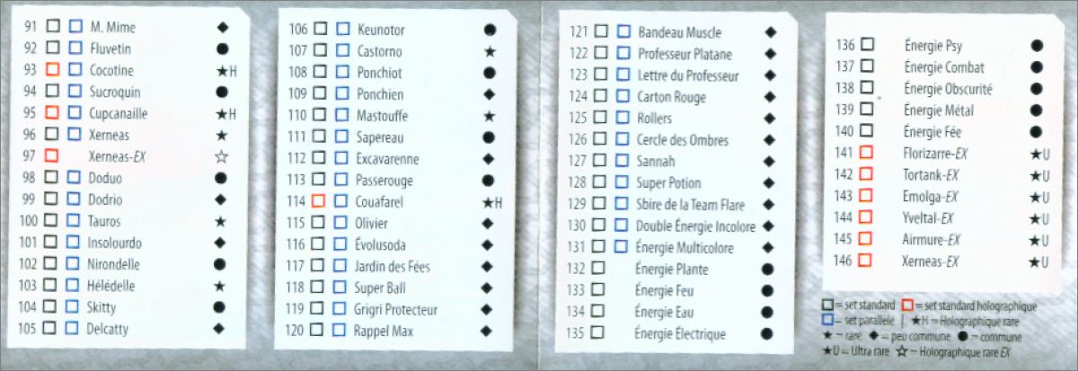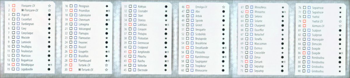 Cartes ex *ex : 1, 2, 29, 30, 46, 79, J79, 80, 97, J97, 141, 142, 143, 144, 145, 146