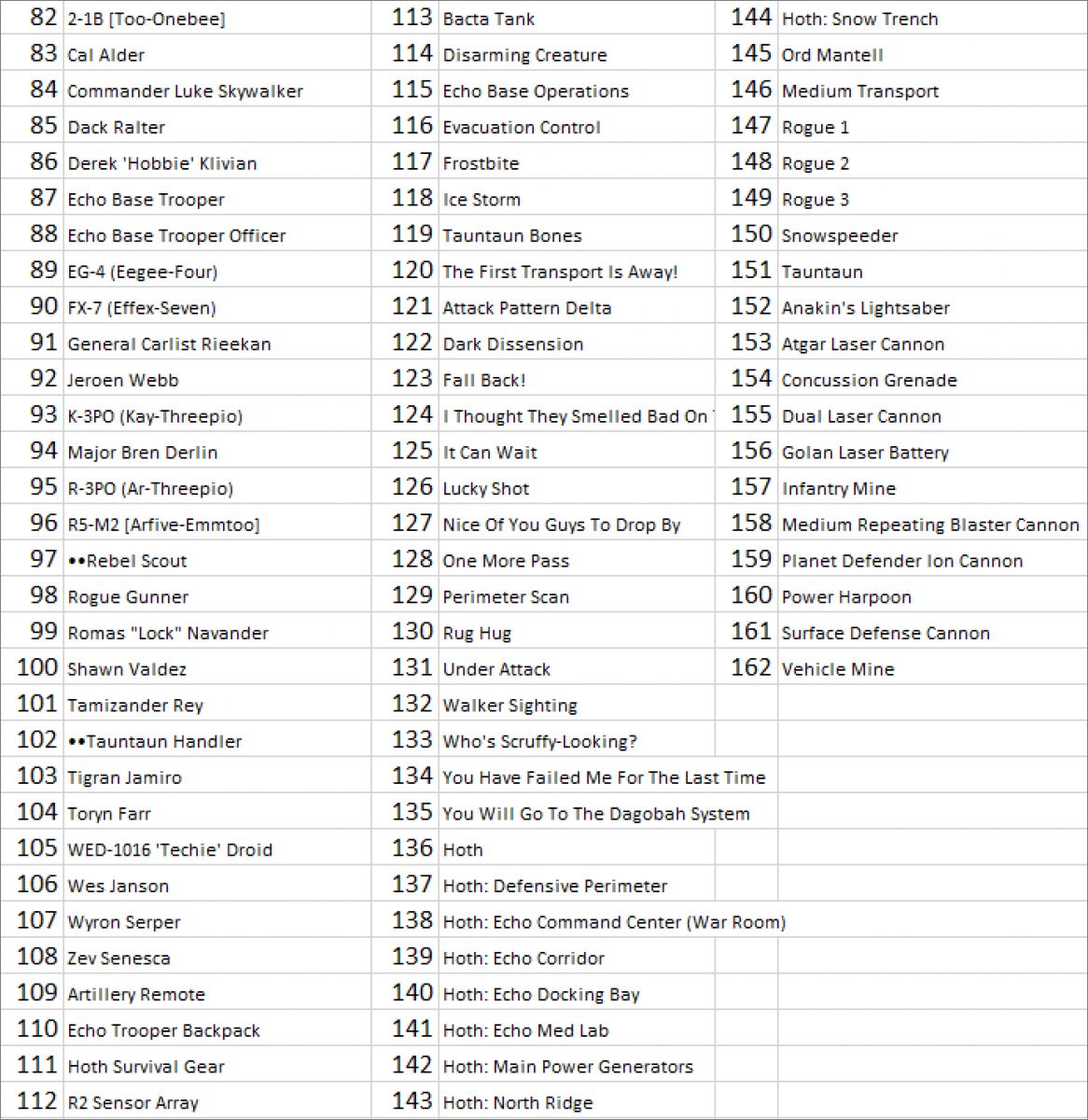 Cartes peu communes *pco : 3, 8, 13, 14, 16, 17, 19, 23, 25, 29, 30, 32, 39, 41, 42, 43, 48, 53, 56, 59, 60, 62, 64, 65, 76, 77, 80, 83, 86, 92, 99, 100, 101, 103, 104, 107, 116, 118, 119, 121, 126, 128, 131, 132, 136, 138, 142, 145, 146, 150, 153, 155, 156, 160